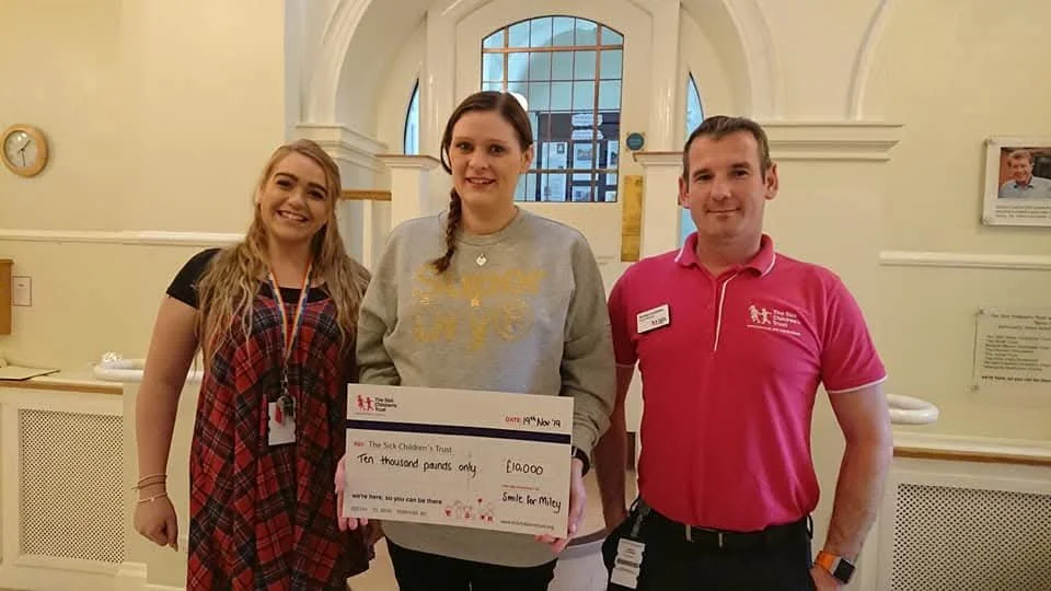 In 2024, Lesley and Dom (Miley’s parents) hand delivered another £10,000 grant to The Sick Children’s Trust (Crawford House).